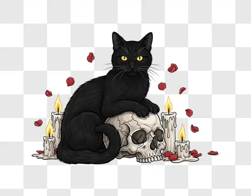 Download a stunning free image of a Black Cat on Skull With Candles and Rose Petals perfect for your creative projects. Get this captivating gothic visual now.
