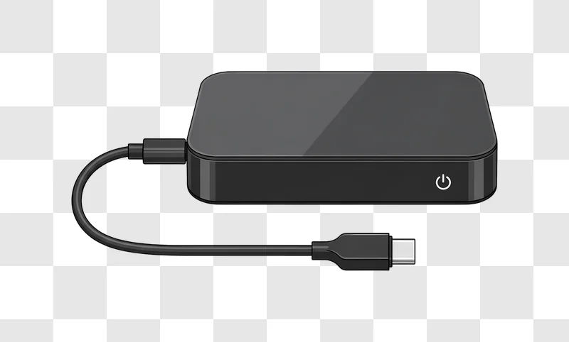Download a free high-quality image of a black rectangular device with a power symbol and USB-C cable for your design needs.