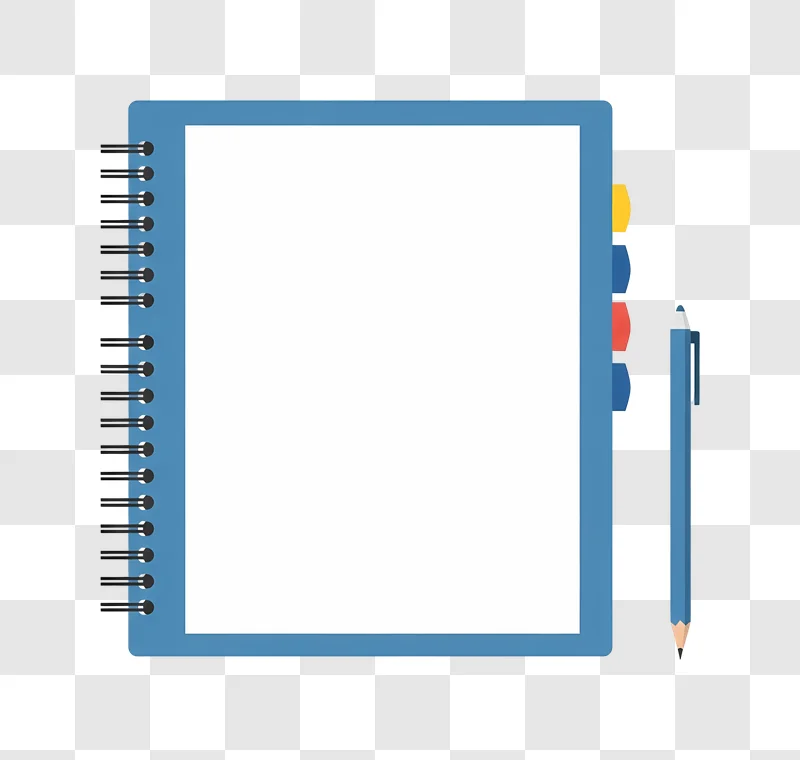 Discover this high-quality graphic featuring a vibrant Blue Spiral Notebook With Blank Page and Pencil, perfect for your creative projects. This free image download showcases a clean, unlined page ready for your ideas, accompanied by a simple pencil, making it an ideal design resource for various applications. Use this visually appealing illustration for web design, social media graphics, personal journaling inspiration, or adding a touch of organization to your blog posts. Download this versatile asset to enhance your content with a touch of stationery charm.
