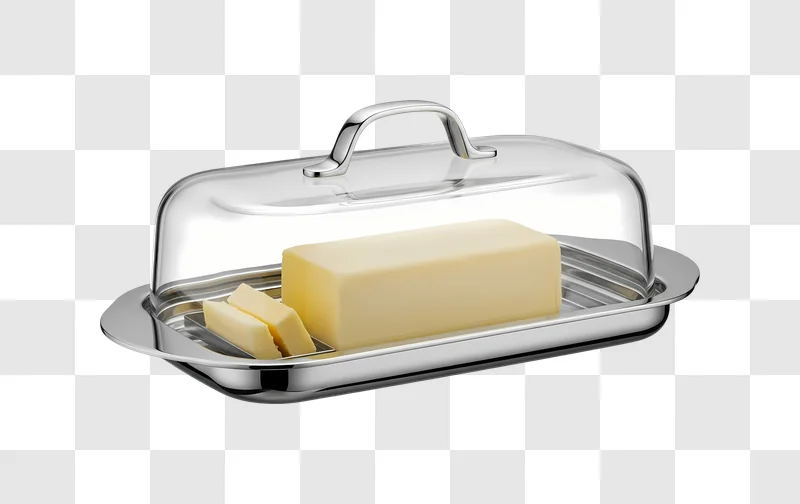 This free image showcases a beautiful Butter in Glass Butter Dish, presenting a pristine block of butter nestled within a clear, elegant glass container, ready for use. This high-quality graphic provides a clean and inviting illustration, perfect for a variety of creative projects. Download this versatile design resource to enhance your web design, social media posts, branding materials, or food blogs, adding a touch of classic charm without any cost.