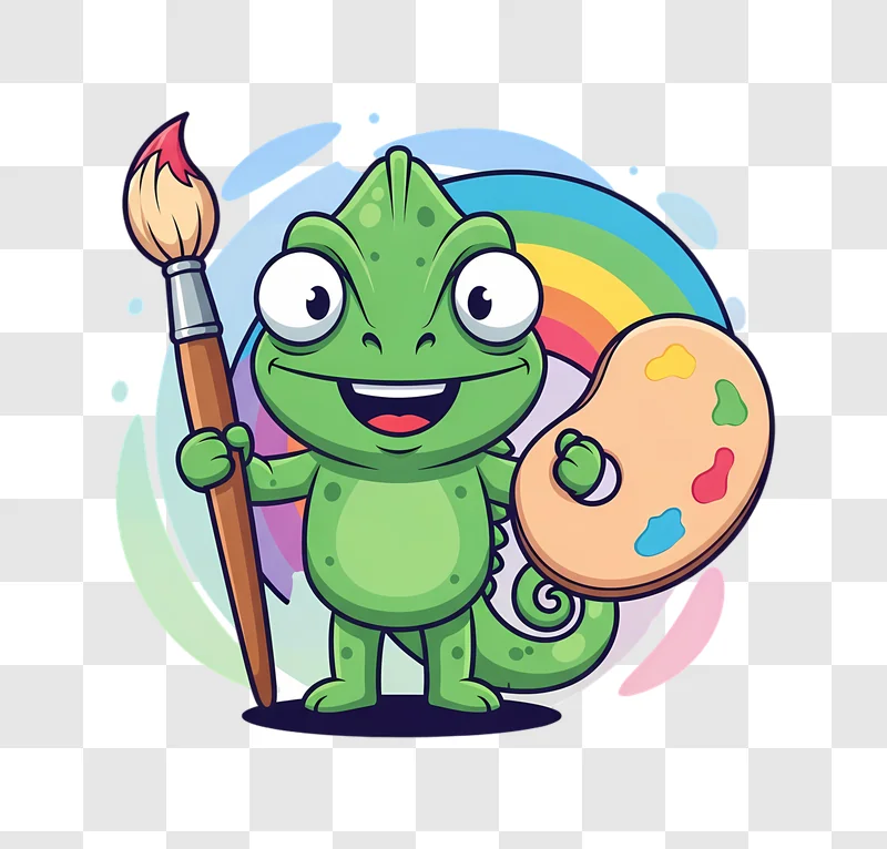 Discover our free high-quality image of a Cartoon Chameleon Painter With Palette and Rainbow, perfect for adding creative flair to your projects.