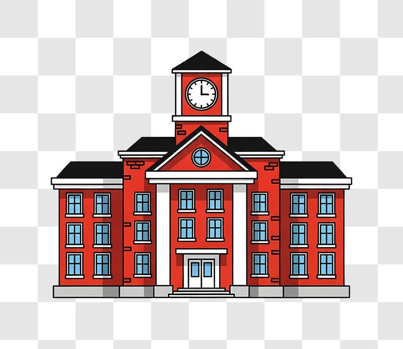 Download a free image of a Cartoon Red Brick School Building With Clock, a high-quality graphic perfect for your design projects.