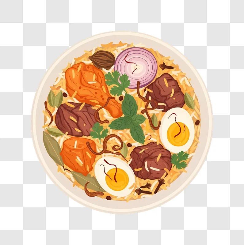 Experience the vibrant flavors of Chicken Biryani With Egg and Spices captured in this stunning free image, a high-quality graphic perfect for culinary blogs or food-related web design. This detailed illustration showcases the aromatic rice, succulent chicken pieces, and perfectly cooked eggs, making it an excellent download for social media posts, recipe cards, or promotional materials. Utilize this versatile design resource to add a touch of deliciousness to your next project.