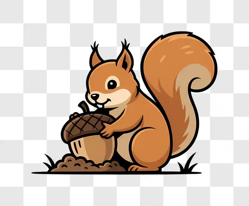 Get a free image of a cute cartoon squirrel holding an acorn in the ground for your creative projects.