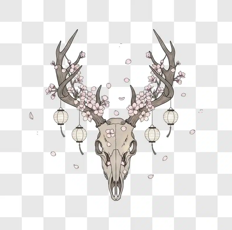 Download a free image of a Deer Skull Adorned With Cherry Blossoms and Lanterns. High-quality graphic for your creative projects.