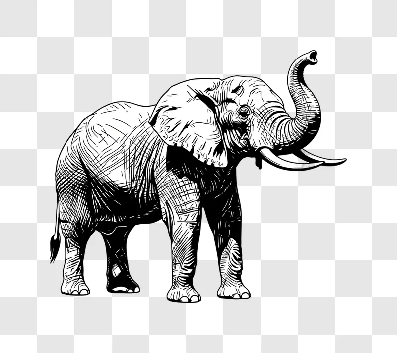 Download free Detailed Elephant Line Art With Raised Trunk. Enhance your projects with this majestic animal illustration, perfect for web, print, and design needs.