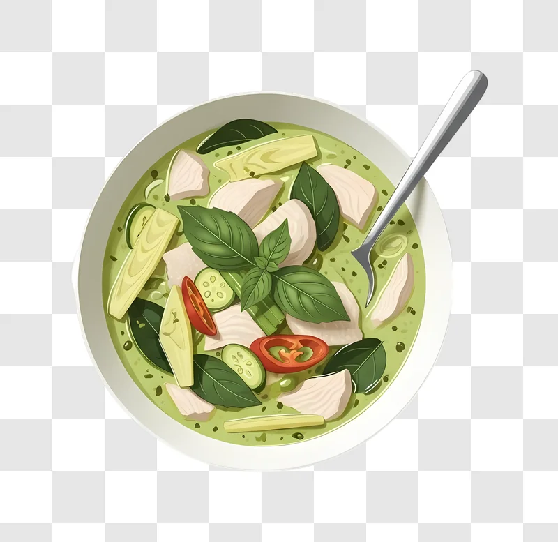 Discover a vibrant Green Curry With Chicken in Bowl, a delicious visual feast perfect for your next project. This high-quality graphic captures the rich textures and inviting colors of this classic dish, making it an excellent free image for blogs, culinary websites, or food-themed social media posts. Easily download this versatile design resource to add a touch of exotic flavor to web design elements, marketing materials, or even digital menus.