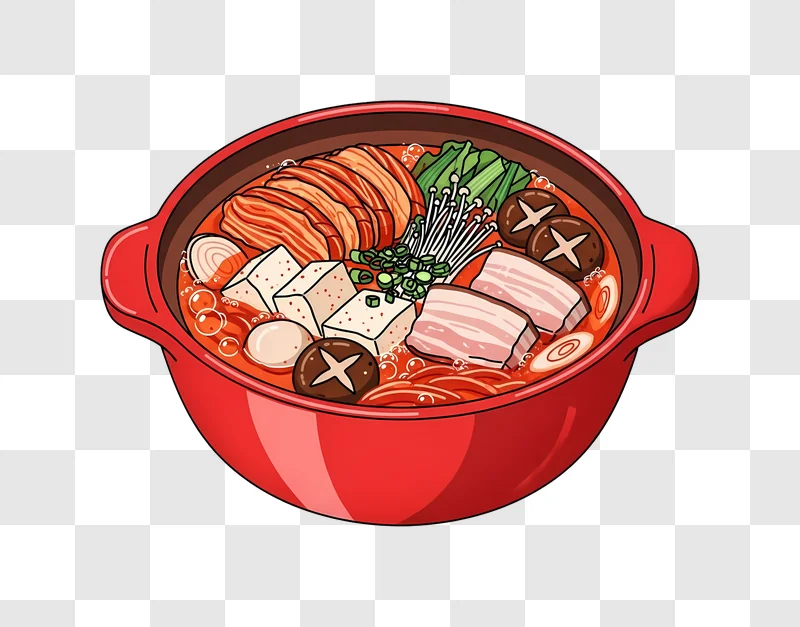 Enjoy this vibrant free image of Kimchi Stew in Red Pot With Pork, a steaming bowl of deliciousness presented in a rustic red pot, perfect for culinary blogs or recipe websites. This high-quality graphic captures the rich colors and textures of the popular Korean dish, making it an ideal design resource for various projects. Download this illustration to enhance your web design, social media posts, or promotional materials with an appetizing visual. It’s a fantastic free image to elevate any food-related content.