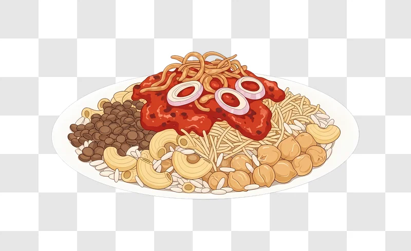 Download this appetizing Koshary Dish With Tomato Sauce and Onion Rings as a free image, a high-quality graphic perfect for culinary blogs or food-related web design projects. This vibrant illustration showcases the layered textures and rich colors of the popular Egyptian dish, complemented by crispy onion rings, making it an excellent design resource. Utilize this visually appealing image for social media posts, menu design, or engaging website banners to entice viewers. Its detail and clarity ensure it will elevate any project requiring a touch of delicious food photography.