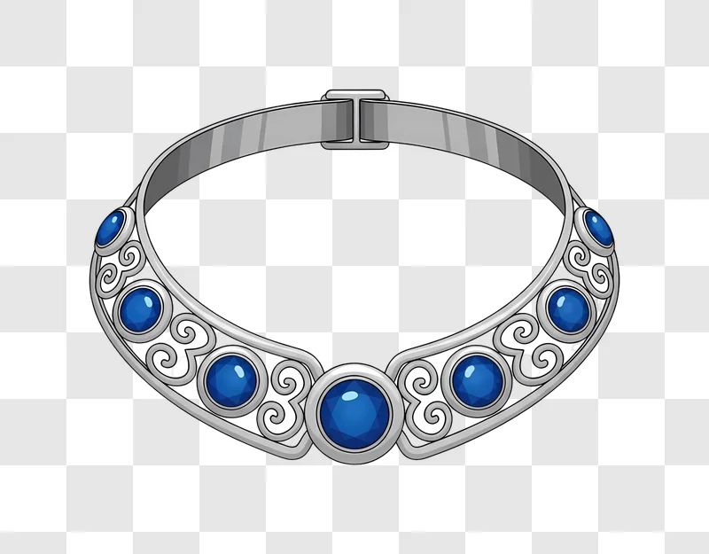 Behold the exquisite Ornate Silver Choker With Blue Gems, a captivating high-quality graphic available for free image download. This stunning illustration showcases intricate silverwork adorned with vibrant blue gemstones, perfect as a versatile design resource. Its elegant aesthetic makes it ideal for enhancing web design projects, enriching social media posts, adding flair to posters, or elevating branding materials and blogs.