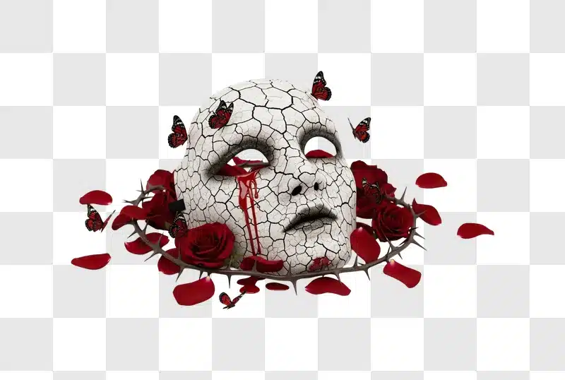 Discover a compelling free image featuring a Shattered Mask Weeping Blood With Roses Butterflies, a striking visual that blends fragility with dark beauty. This high-quality graphic captures a broken mask shedding crimson tears amidst delicate roses and ethereal butterflies, perfect as a design resource for your next project. This illustration is ideal for download and can enhance web design, social media posts, artistic posters, or unique branding elements, offering a powerful narrative for blogs. It’s a captivating free image for creative endeavors.