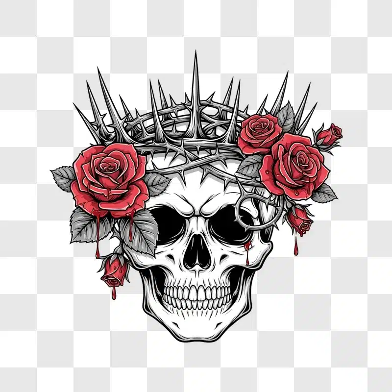 Skull With Thorny Crown and Dripping Red Roses