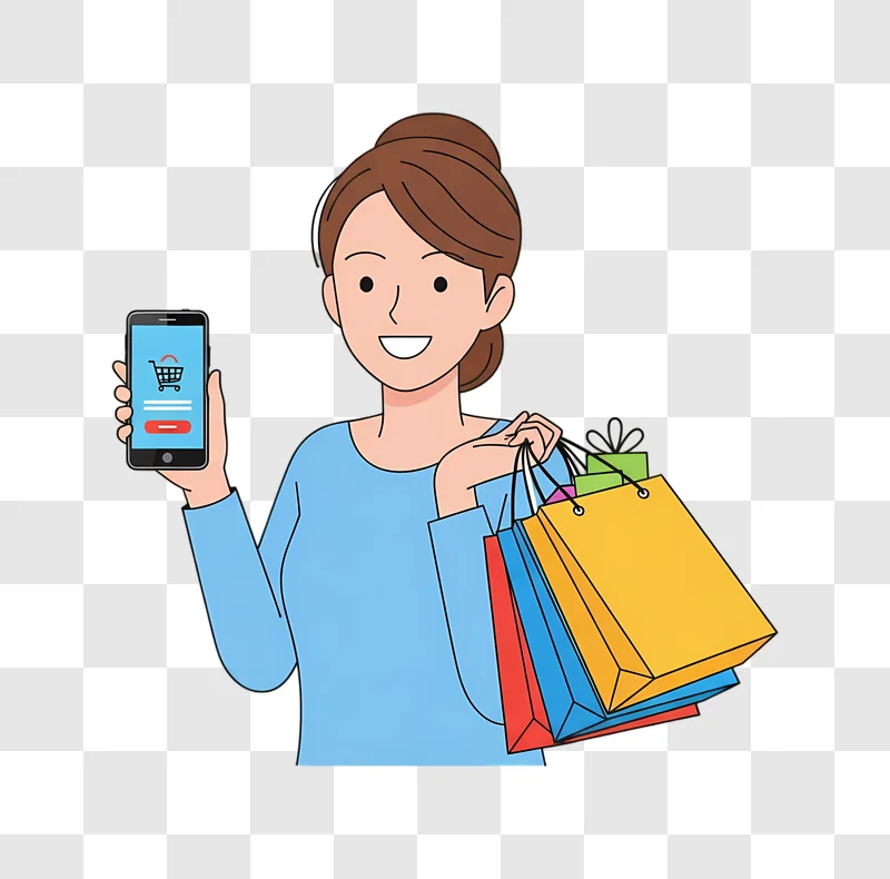 Discover a vibrant image of a Smiling Woman Online Shopping With Bags, perfect for your projects. Download this high-quality photo for free now.