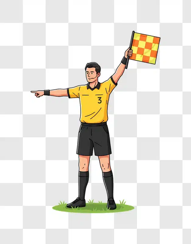 Free download image of a Soccer referee assistant holding a checkered flag and pointing, ideal for sports blogs and designs. Get yours now.