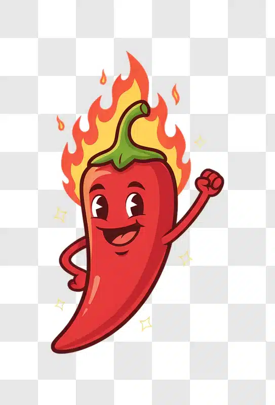 Get a free image of a happy spicy red chili pepper character on fire with a raised fist. Perfect for vibrant, energetic designs.