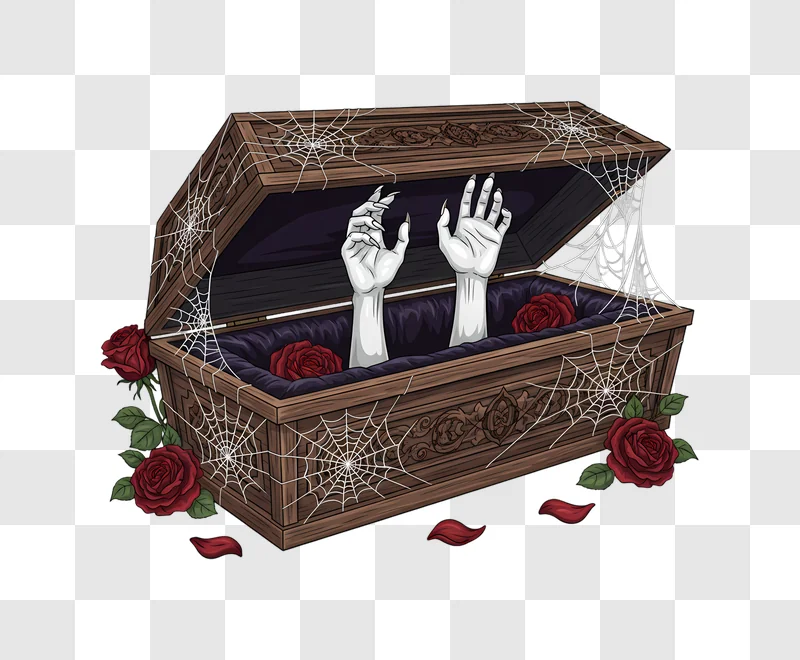 Download the striking Spooky Coffin With Zombie Hands and Red Roses image for free. Perfect for your eerie Halloween designs and gothic-themed projects and more.