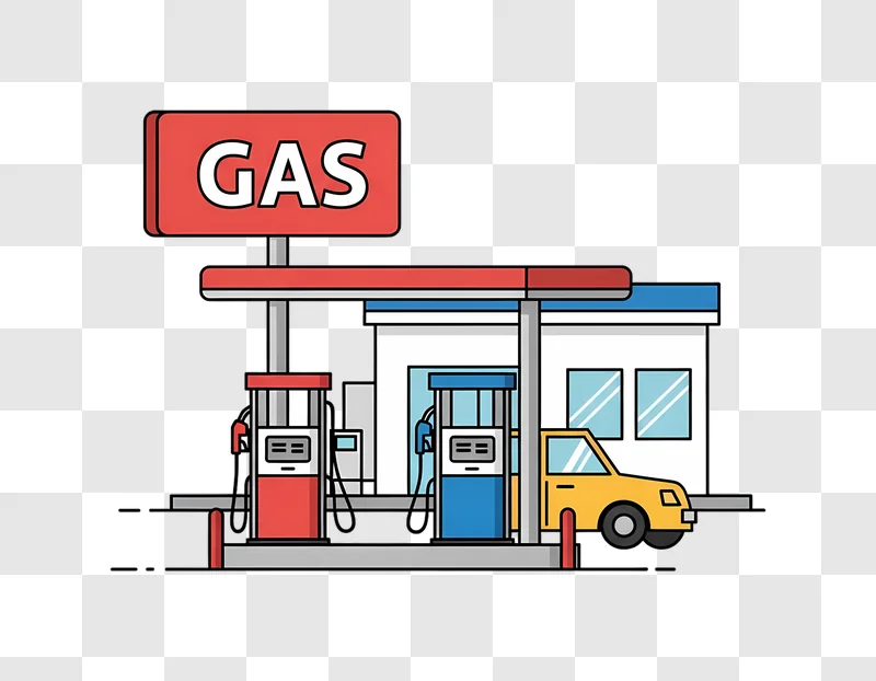 Download this captivating Stylized Gas Station With Yellow Car image for free. Enhance your projects with this vibrant, unique artwork, perfect for web design and creative content.