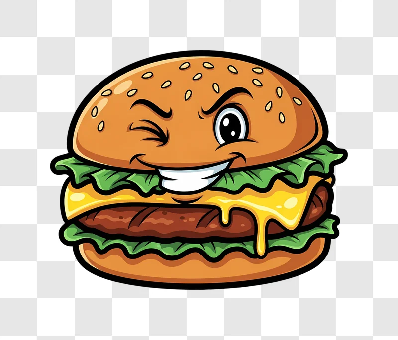 Download our fun Winking Cartoon Burger With Melting Cheese image for free! Perfect for blogs, menus, and social media. Get this charming graphic now.
