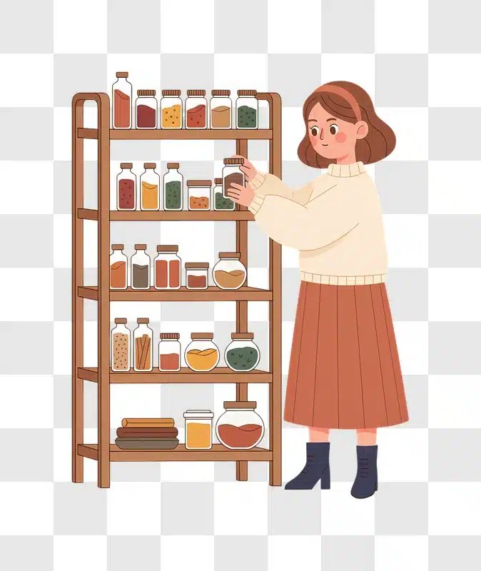 Free download of a woman organizing jars on a wooden shelf, ideal for home organization blogs, lifestyle sites, and creative projects.