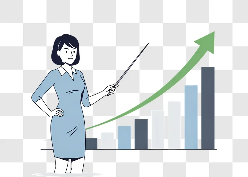 Visualize success with this Woman Pointing at Growing Bar Chart, a high-quality graphic perfect for your next project. This vibrant illustration captures a woman gesturing towards an upward trending bar graph, symbolizing growth, progress, and positive financial or business outcomes, making it an excellent design resource. Download this free image to enhance your web design, social media posts, presentations, or blog articles. It’s ideal for conveying performance data or strategic development with clarity and impact.