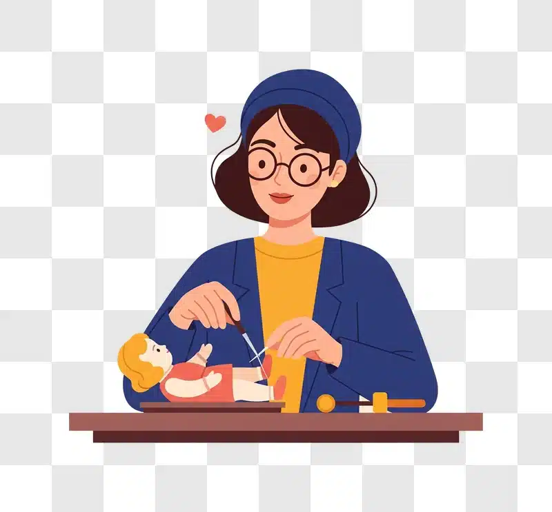 Discover our free image of a Woman Repairing a Doll With Tools on a Table, perfect for craft blogs or creative projects. Download now.