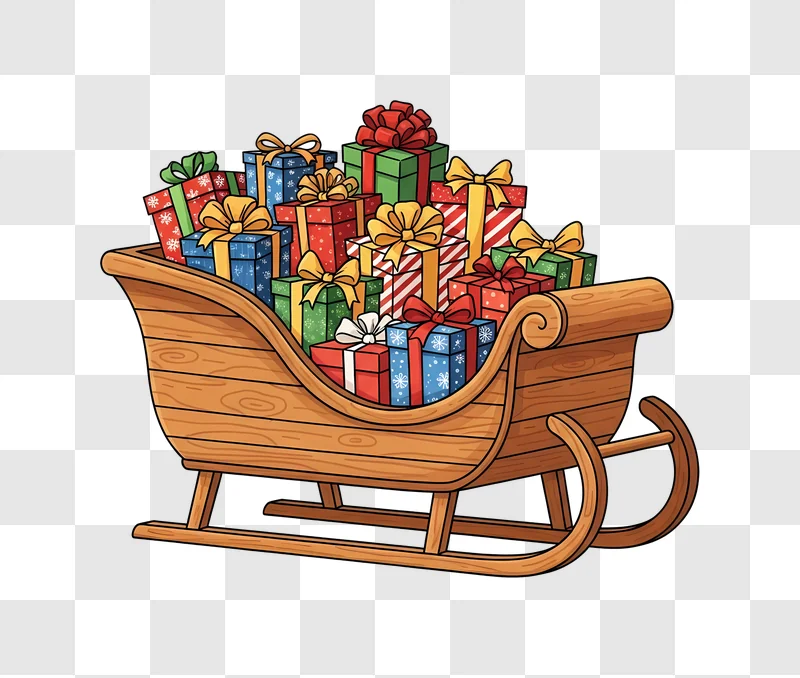 This Wooden Sleigh Full of Christmas Gifts image offers a charming and festive scene, perfect as a free image download for your holiday projects. The sleigh, crafted from rustic wood, is overflowing with beautifully wrapped presents in various sizes and colors, creating a vibrant and inviting high-quality graphic. This delightful illustration is an ideal design resource for enhancing web design, social media posts, seasonal posters, or festive blogs, providing a touch of warmth and holiday cheer to any digital creation.