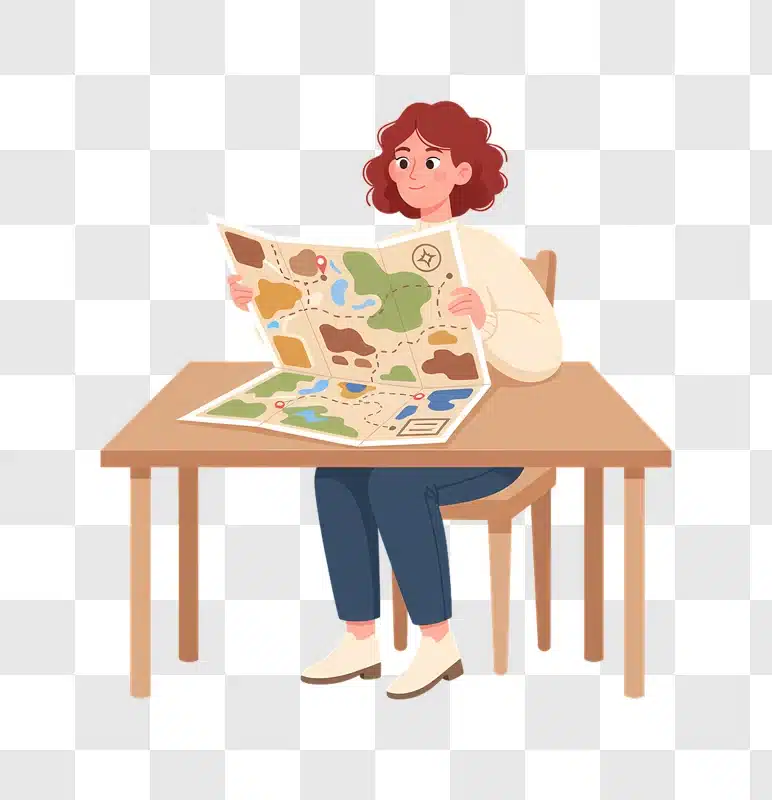 Download this captivating image of a Young Woman Studying a Treasure Map at a Wooden Table for free. Perfect for blogs, websites, and creative projects.