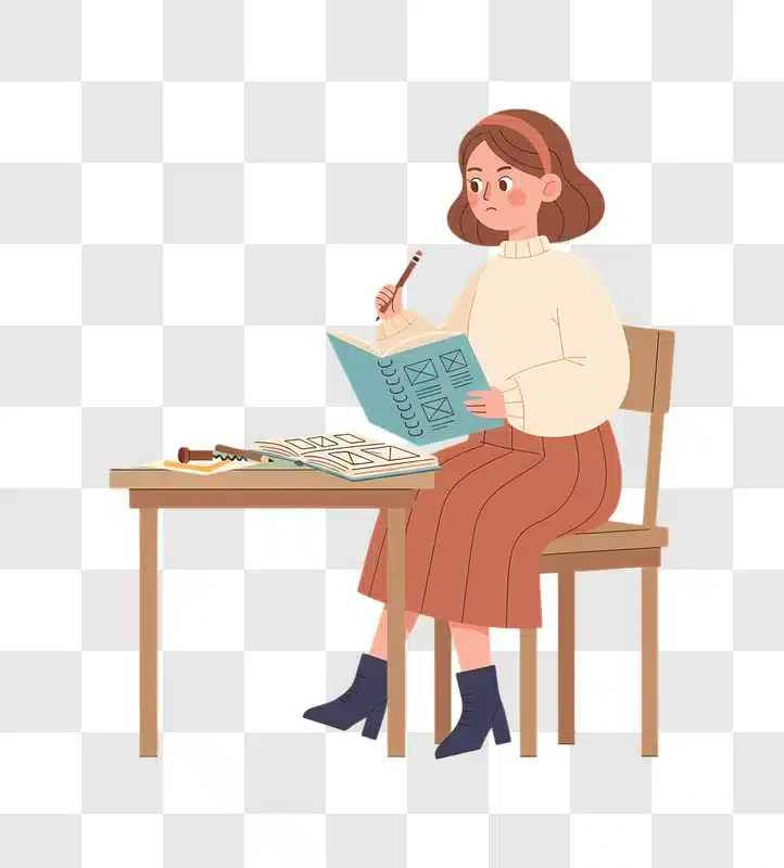 Young Woman Studying at a Desk With a Book and Pencil