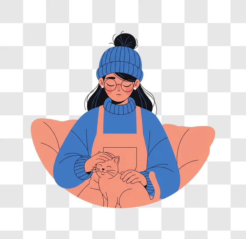 Young Woman Wearing Blue Beanie and Glasses Petting Her Cat